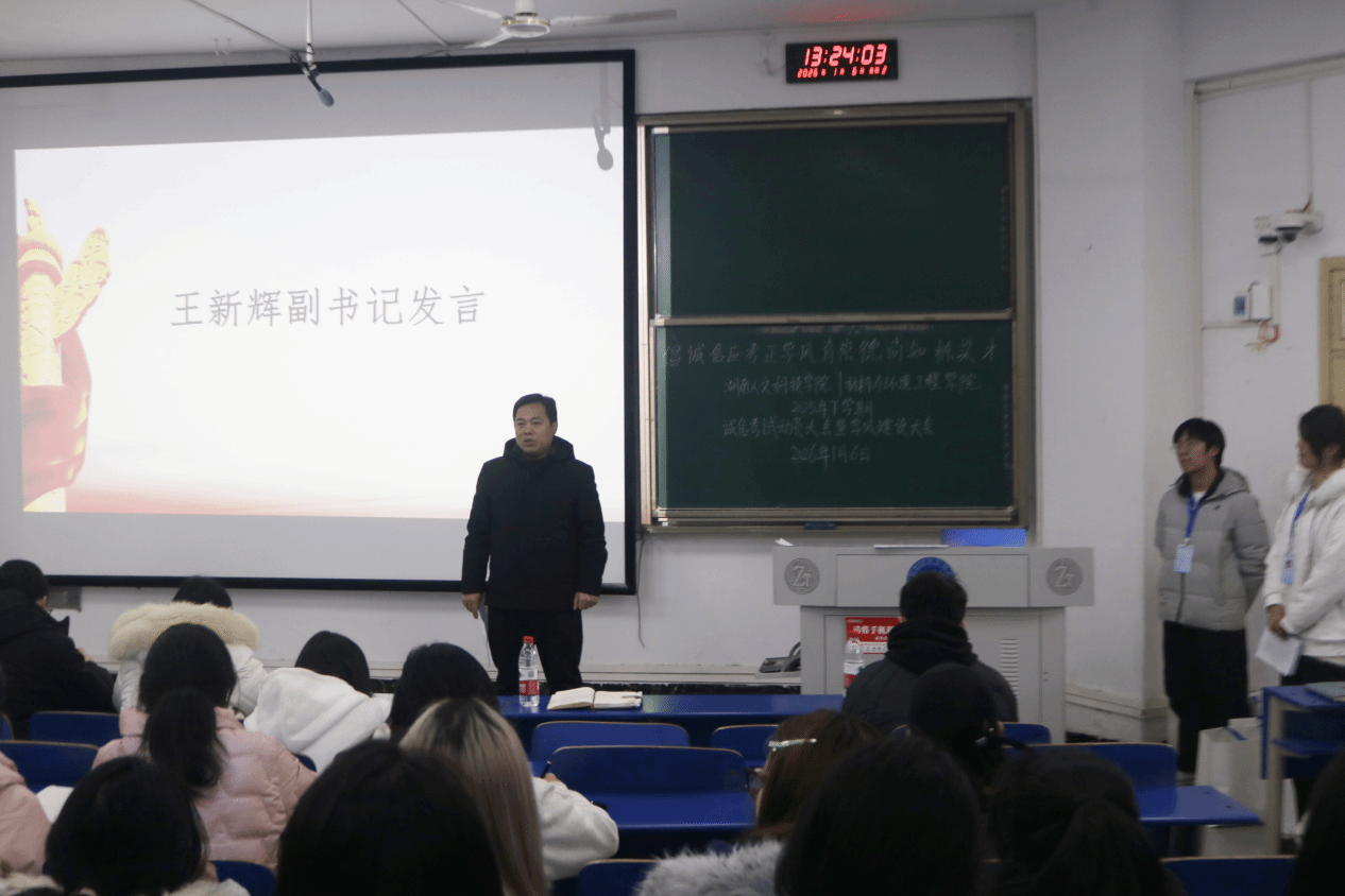 2026年1月6日中午,材料与环境工程学院于致远楼119召开本学期第二次学风建设大会暨诚信考试动员大会。材料与环境工程学院党总支副书记王新辉、各辅导员老师、23至25级班委团体出席会议。学习实践部志愿者柏申晴子主持会议。大会伊始,学习实践部部长李天睿围绕“诚信考试,杜绝舞弊”进行主题宣讲,指出考试是知识检验更是自我能力与诚信品格的锤炼。随后全体参会学生起立,宣誓诚信考试承诺书,铿锵有力的誓言彰显践行诚信、捍卫学风的决心。...