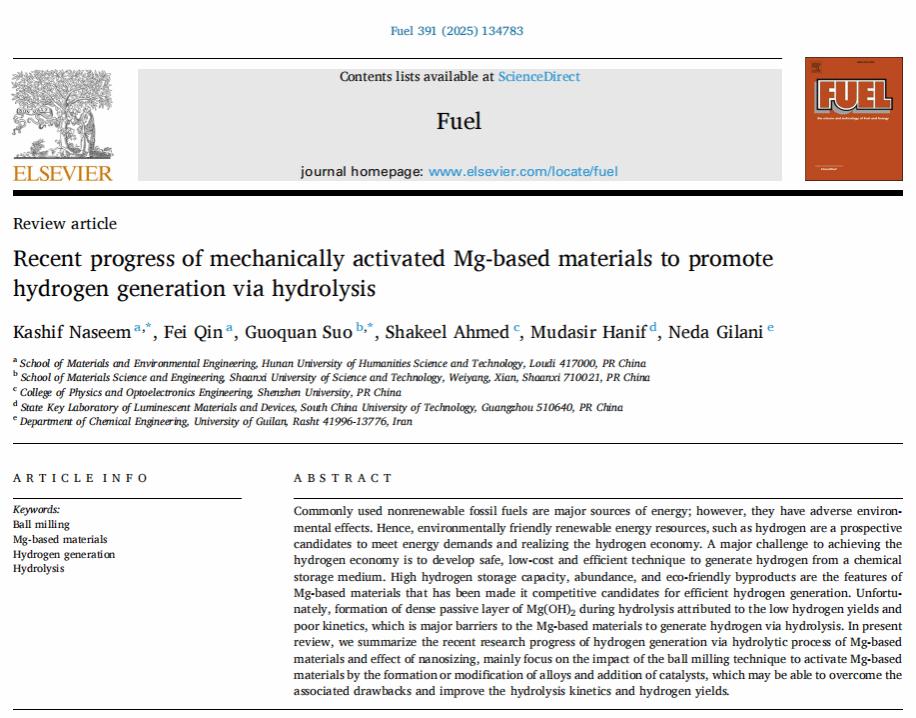 近日,材料与环境工程学院Kashif Naseem博士在工程技术领域TOP期刊《Fuel》(中科院1区,IF:6.7)发表题为“Recent progress of mechanically activated Mg-based materials to promote hydrogen generation via hydrolysis”的综述论文。beat365英国官网为该论文的第一完成单位,Kashif Naseem博士为该论文的第一作者与共同通讯作者,华南理工大学发光材料与器件全国重点实验室参与了本研究。
