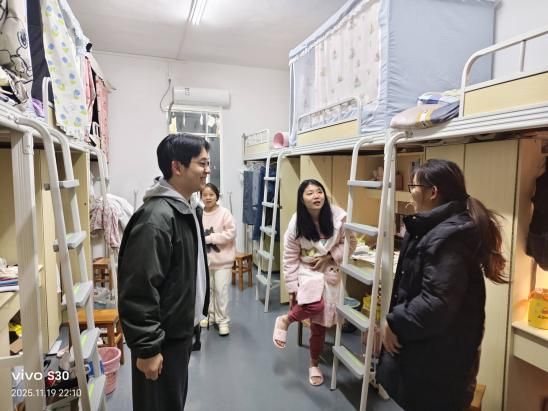 为深入了解学生学习生活状况,筑牢校园安全防线,2025年11月19日晚,材料与环境工程学院党总支副书记王新辉带领由各班班主任、辅导员组成的走访小组,深入学生宿舍开展走访检查工作,将消防安全知识与学院关怀送至学生身边。
