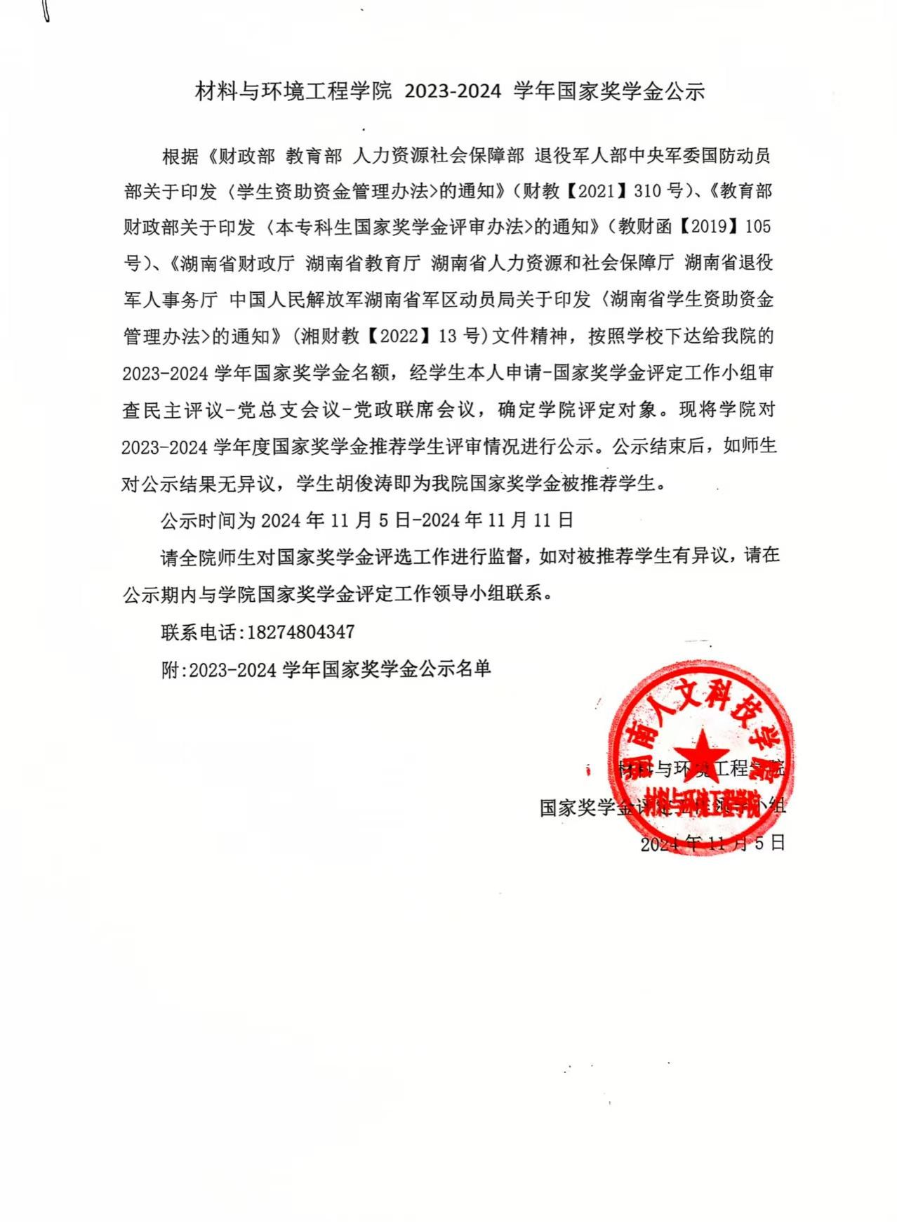 材料与环境工程学院 2023-2024 学年国家奖学金第二批公示