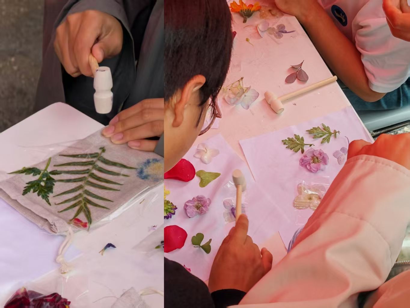 活动现场,同学们挑选心仪的叶片和花瓣,润湿后在手帕或帆布袋上进行创意布局,再用木锤轻敲拓印。清脆的敲击声中,植物的色彩与纹理在织物上绽放出自然之美。辅导员也积极参与其中,现场氛围轻松愉快。通过亲手创作,同学们不仅体验了传统拓染工艺的魅力,也在专注与创作中释放压力、平复心绪。