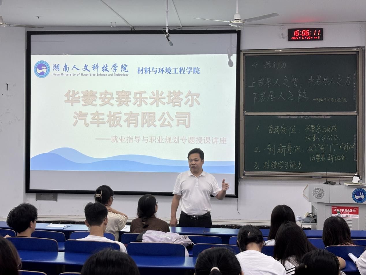 6月20日下午,材料与环境工程学院在致远楼119成功举办就业指导与职业规划专题讲座。本次讲座特邀华菱安赛乐米塔尔汽车板有限公司贺先贵经理担任主讲嘉宾,学院党总支副书记王新辉、陈畅亚博士及 2022 级全体学生共同参与。