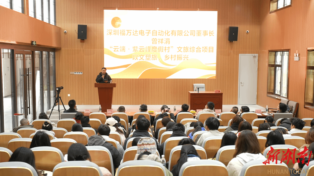 在云端会客室,深圳福万达电子自动化有限公司董事长曾祥涓向同学们介绍了“云端·紫云峰度假村”文旅综合项目的实施情况,以及开展以文塑旅、乡村振兴的美好蓝图。 大家进行了热烈的交流。