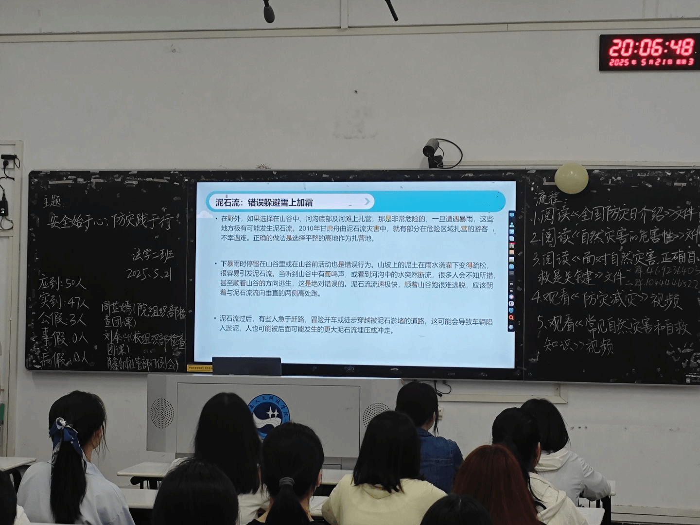 为增强学生安全意识,提升防灾减灾能力,5月21日,我院以线上线下相结合的方式,开展“安全始于心,防灾践于行”主题团课活动。2024级全体同学参与线下团课,2022、2023级同学通过线上形式参与。