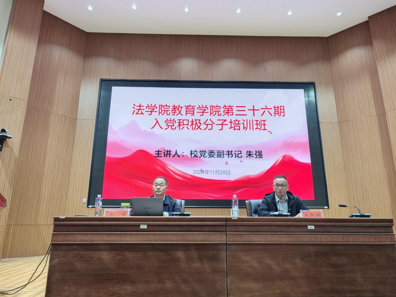 11月28日晚,学校党委副书记朱强教授在匠成楼为法学院、教育学院第36期入党积极分子共133人授课。法学院、教育学院学工队伍全体人员参会,法学院党总支书记肖兵明主持。