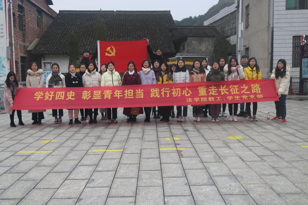 为加强革命传统教育,增强党员责任意识和爱国情怀,12月15日,根据中共beat365英国官网委员会开展“网上重走长征路”暨推动“四史”学习教育工作方案,法学院部分师生党员参加教工支部、学生支部联合开展的“学好四史,彰显青年担当。践行初心,重走长征之路”主题党日活动。师生党员共赴贺国中故居参观学习。