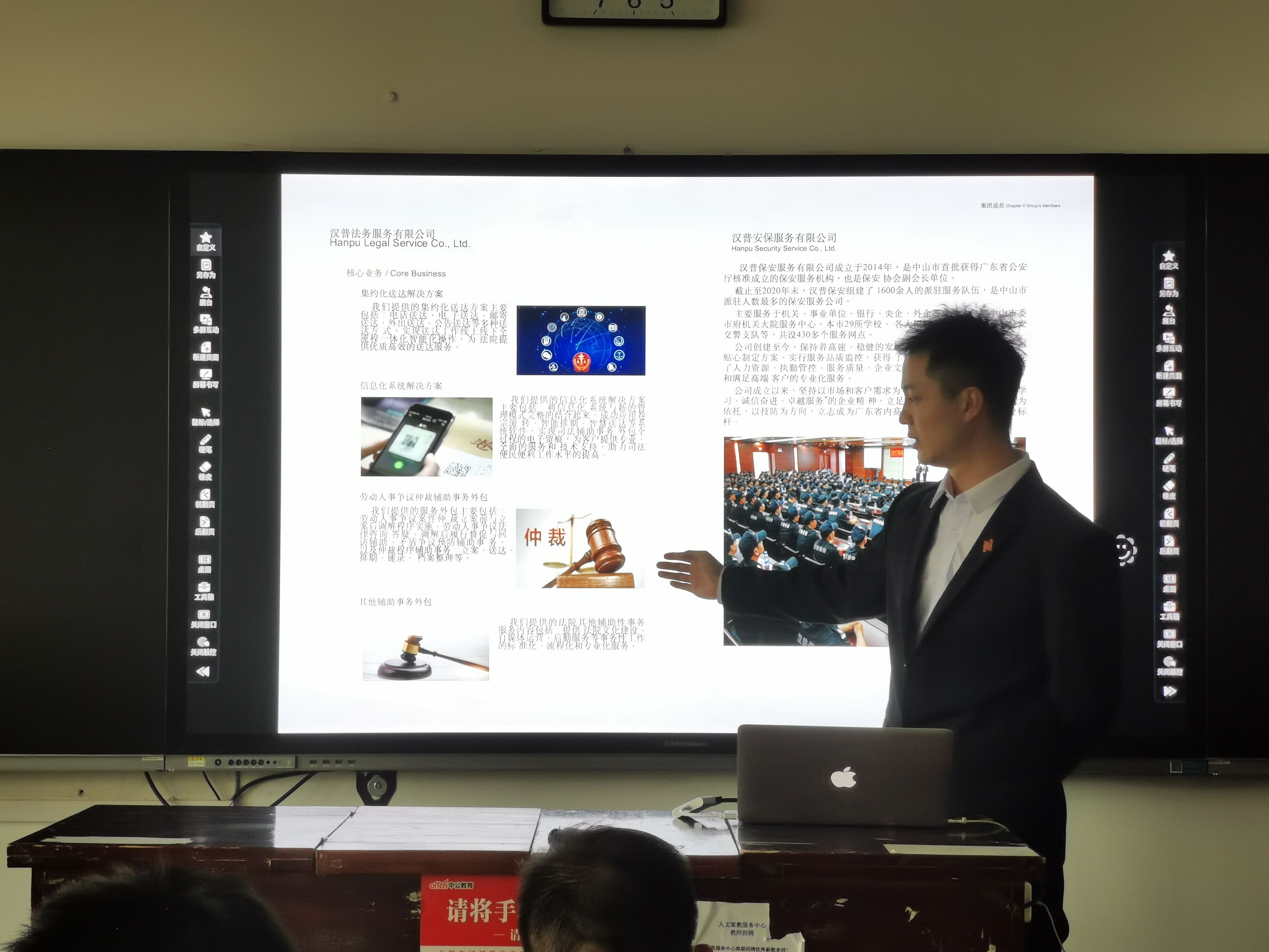 会上,刘坤旺通过PPT展示、面对面交流等方式向大家介绍了公司的概况、职业发展方向、人才需求和经营理念。他就公司的一些规章制度、福利待遇、企业文化、现有产业结构、组织构架、人力资源政策等几个方面向在座成员作了详细介绍。宣讲结束后,刘坤旺与大家进行交流互动,对同学们的疑问作详细解答,并在会后带领大家现场参观汉普法务公司。