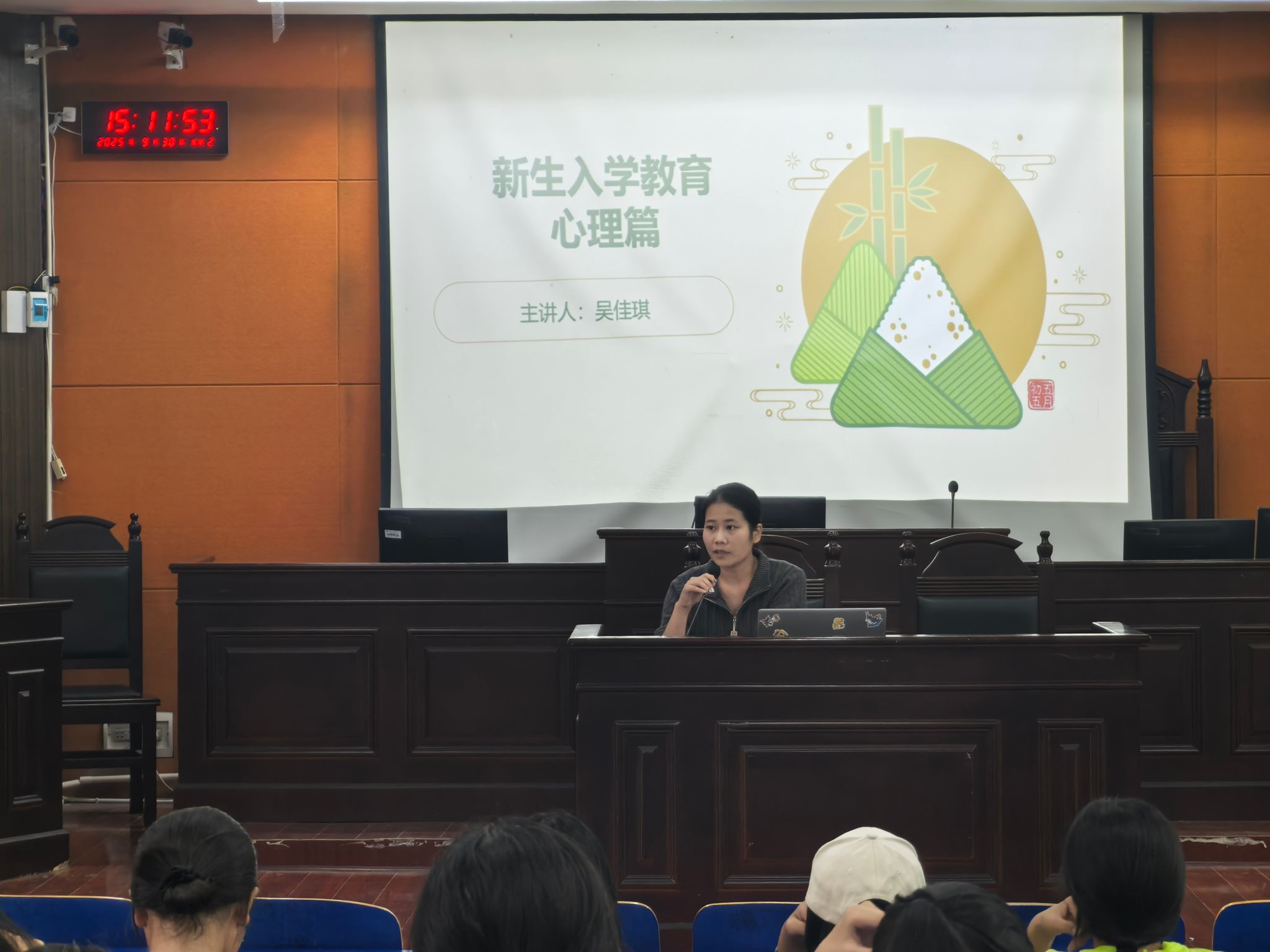 随后,辅导员吴佳琪就心理适应与生活管理等方面进行分享。她指出,大学是人生成长的关键阶段,建议新生主动调整心态,合理安排作息,注重身心健康。在集体生活方面,她鼓励同学们通过加强沟通、共同制定寝室公约等方式,营造和谐融洽的居住氛围,增强归属感。