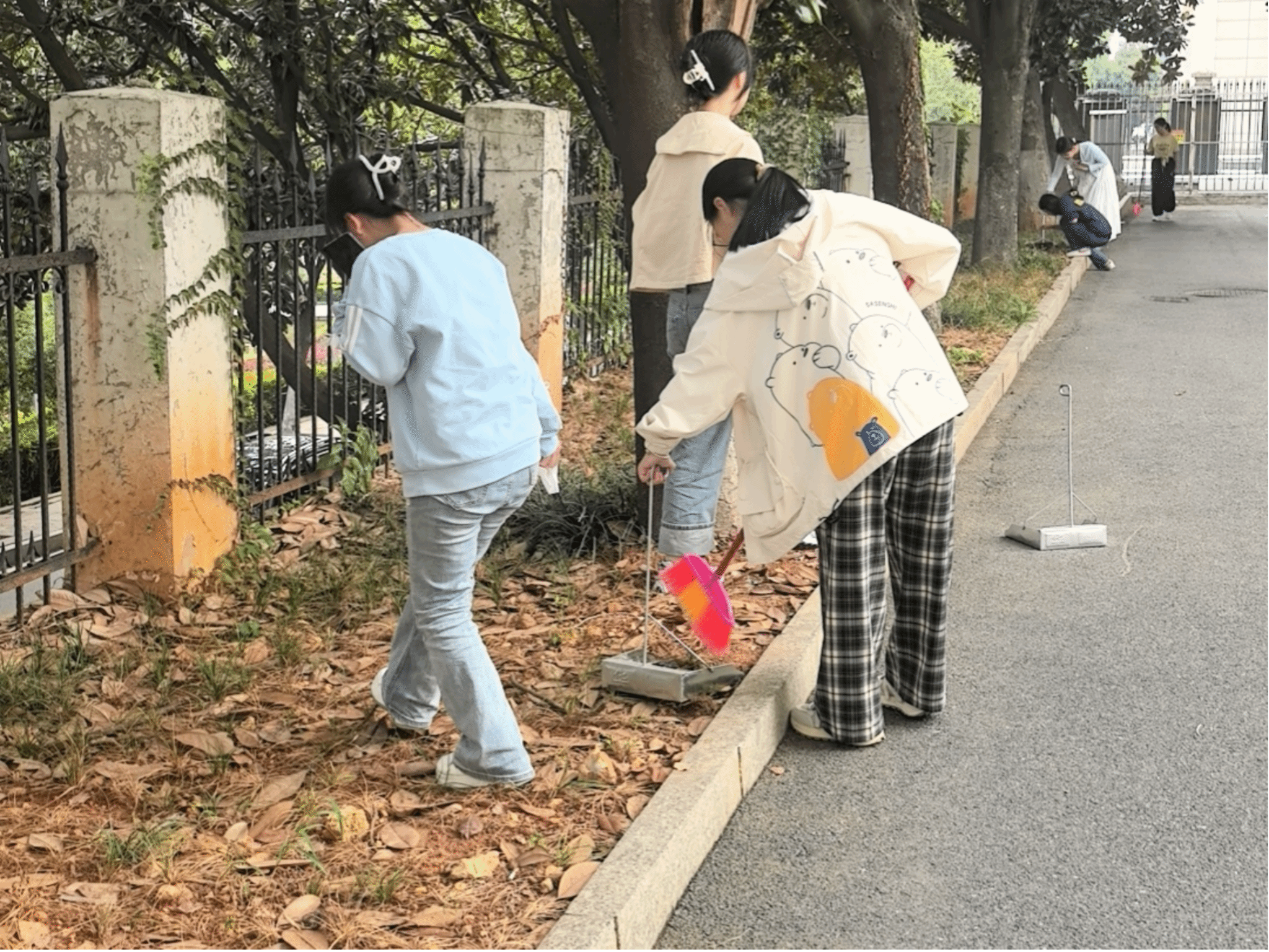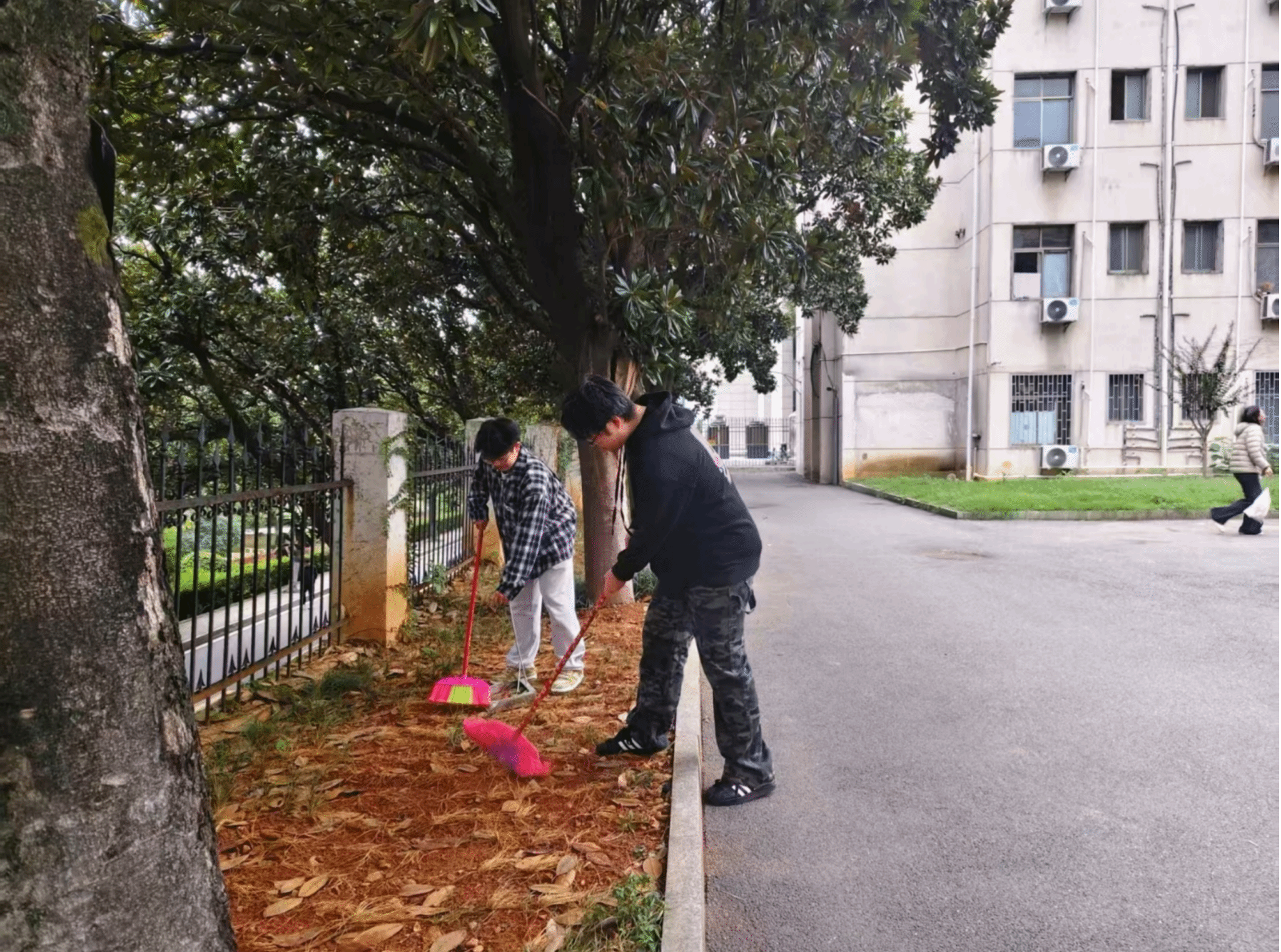 大家热情投入、分工协作。他们细致地捡拾散落在绿植中的垃圾,清扫道路上积存的枯枝落叶,并耐心拔除花圃中的杂草。经过同学们的共同努力,原本略显杂乱的宿舍区域变得焕然一新。