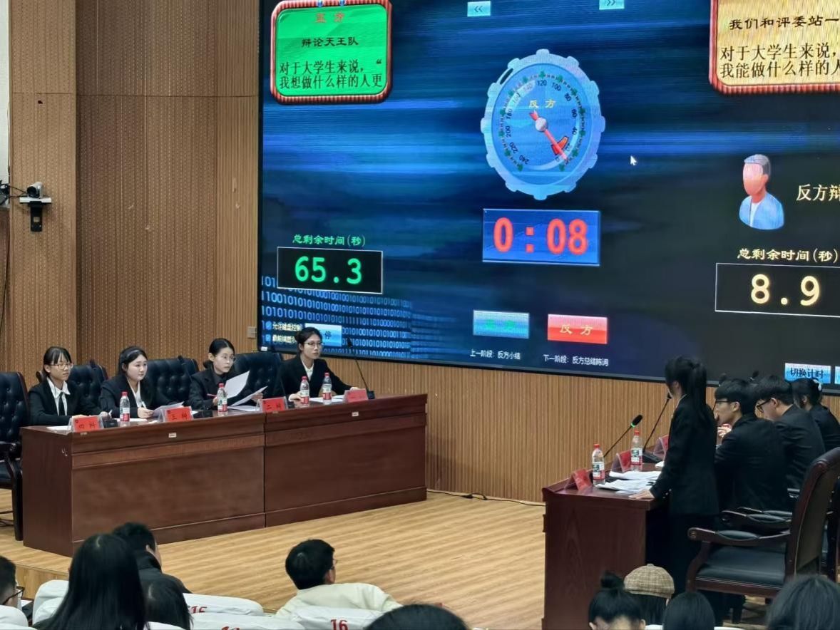决赛辩题主体聚集大学生,围绕“我想做什么样的人更重要”与“我能做什么样的人更重要”展开激烈对决。作为正方,法学院辩手立足“想做”的理想引领核心,将法学专业精神与青年责任担当相结合,以清晰的论点架构、有力的临场反驳,层层递进论证“理想是人生前行的灯塔”。反方信息学院则围绕“现实实践意义”展开论述,双方攻防有序、精彩交锋,赢得阵阵掌声。最终,法学院凭借更具深度的论证、默契的团队协作及出色的现场表现更胜一筹,获得评委团一致认可,将冠军收入囊中。