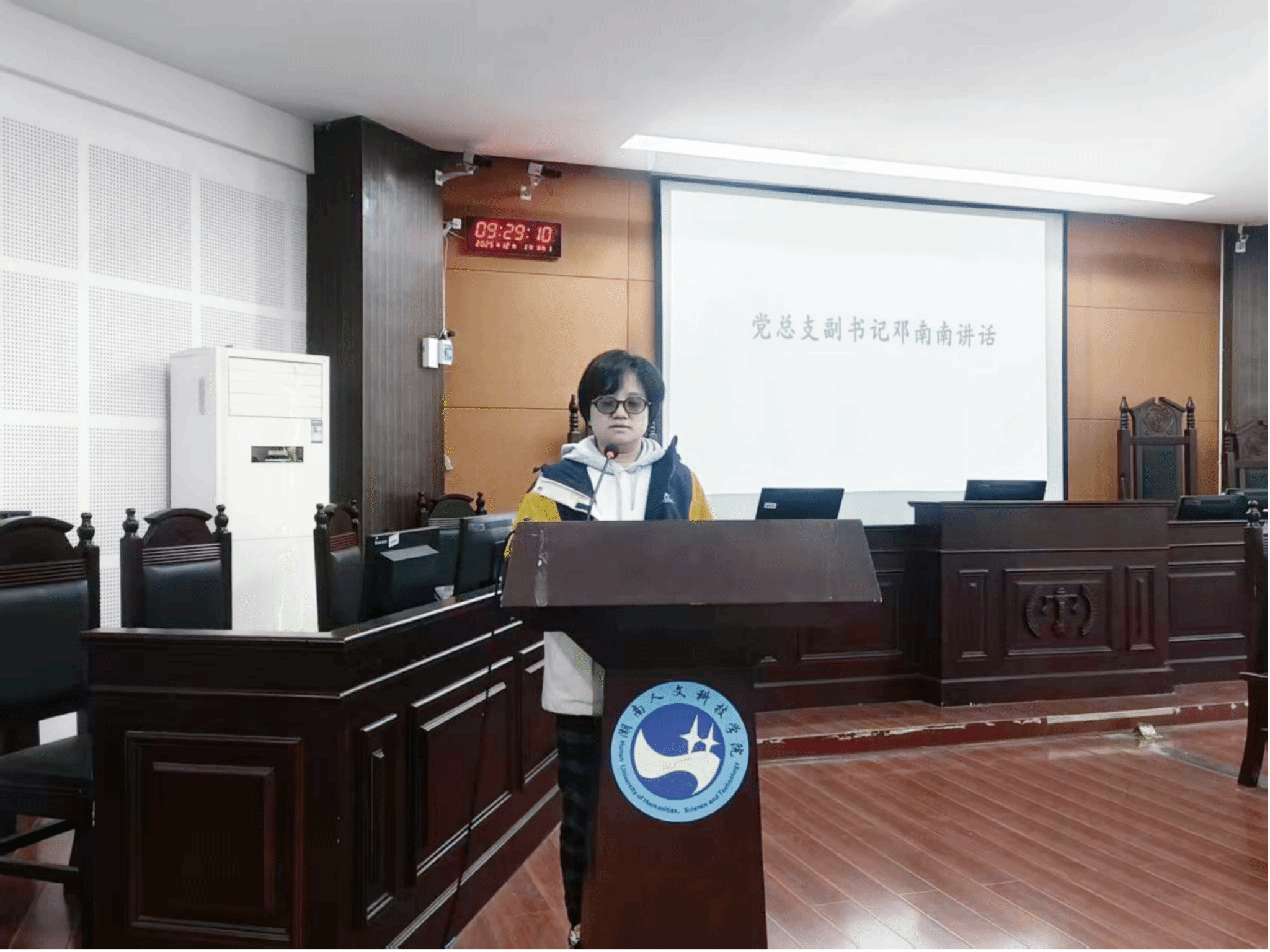 党总支副书记邓南南以“学习之问”为引,深入阐述了治学精神与法学素养的内在联系,鼓励全体同学以获奖者为榜样,坚守法治信仰,锤炼专业能力,努力成长为德法兼修的高素质法治人才。