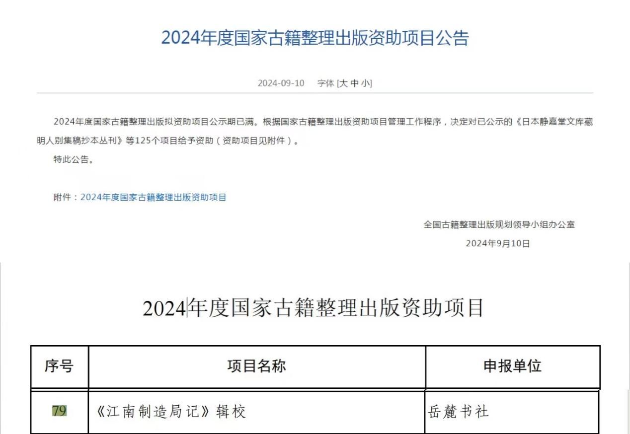 9月10日,国家新闻出版署正式公布了2024年度国家古籍整理立项项目名单。由我院院长朱耀斌教授团队整理,与岳麓书社联合申报的《〈江南制造局记〉辑校》项目获得立项,该项目成果将由岳麓书社负责出版。这是beat365首次获批该类项目。