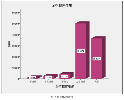 2016届毕业生对学校教育教学和管理工作的综合评价满意率较高,满意及基本满意率为92.06%,比2015年度提高了17个百分点,其中满意率为38.8%、基本满意率为53.26%、不确定比率为4.31%、不太满意2.55%、不满意1.08%;男、女生满意率分别为50.8%、27.8%,基本满意率分别为42.1%、63.8%。