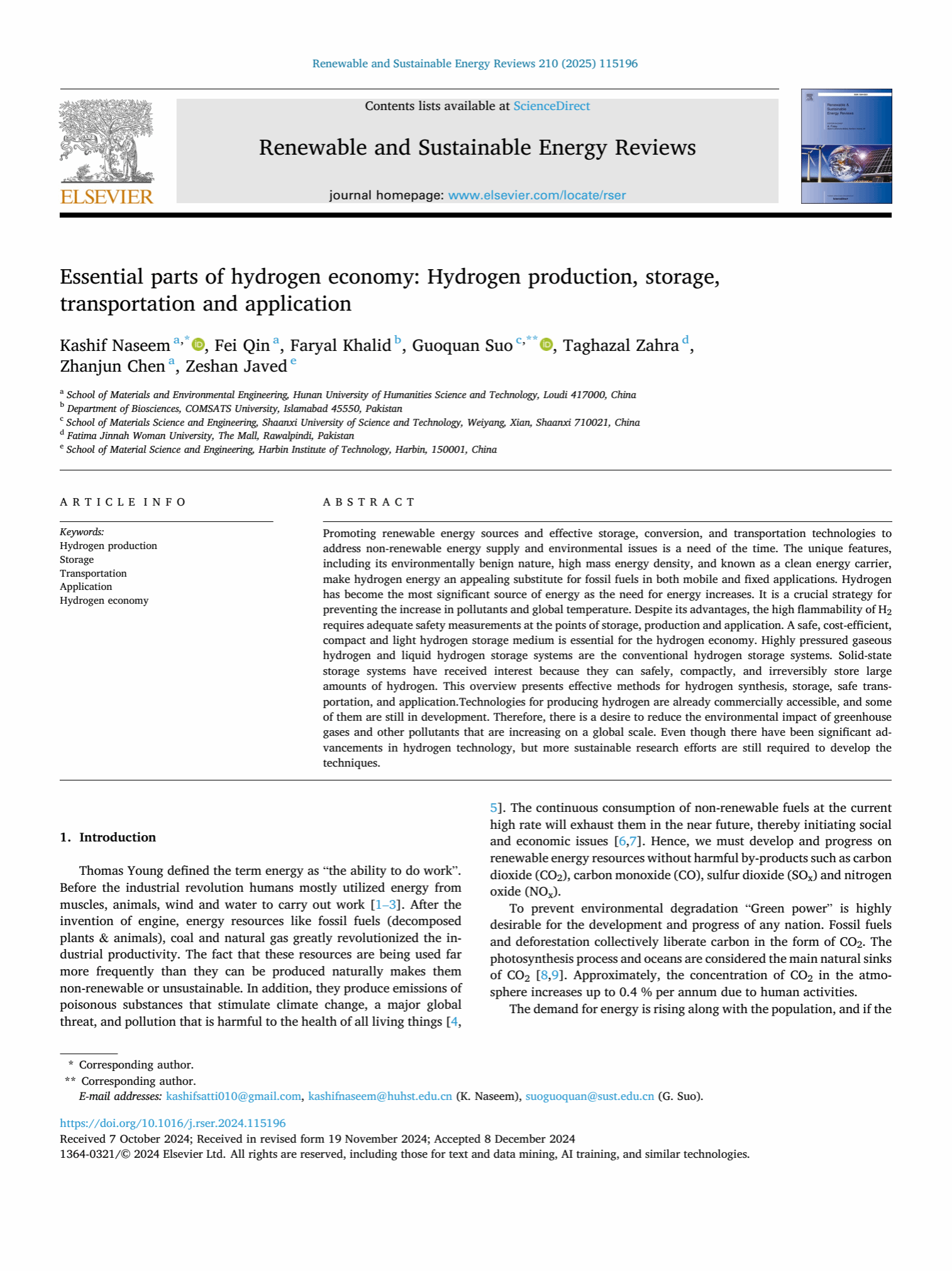 近日,材料与环境工程学院Kashif Naseem博士以第一作者身份在国际能源类顶刊《Renewable & Sustainable Energy Reviews》(SCI,中国科学院全一区,Top期刊,影响因子16.3)发表了题为“Essential parts of hydrogen economy: Hydrogen production, storage, transportation and application ”的综述论文。该综述从技术上详细介绍了近年来氢气生产、储存、运输和应用领域的研究热点,讨论了氢能行业发展目前面临的主要问题,包括:制氢技术仍不成熟、制氢成本相对偏高、氢气的运输和存储技术与设备需进一步完善等。此外,基于当前研究现状,作者建议未来在生产绿色氢气、提高能源利用效率、共建基础设施等方面深入开展研究,为构建绿色氢能产业体系提供了参考。(文/图:阳湘琳;一审:阳湘琳;二审:彭伟才;三审:文瑾)