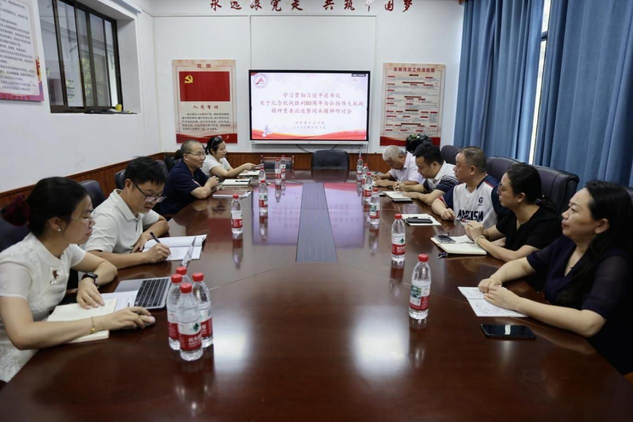观看结束后,马克思主义学院中心组于若谷楼206会议室组织召开“学习贯彻习近平总书记在纪念中国人民抗日战争暨世界反法西斯战争胜利80周年大会上的重要讲话精神”研讨会,学校宣传部常务副部长谢柳受邀参加。院长于意表示:“纪念大会充分展现了我国国防和军队现代化建设的巨大成就,全体教师要以此为契机,引导学生把爱国情、强国志融入报国情、强军行,进一步厚植爱国情怀、强化使命担当。”院党总支书记张卫明在交流中强调:“历史如镜,照见来路,也照亮前程。全体教师要把对历史的敬畏、对先烈的崇敬,熔铸为立德树人的如炬初心,转化为铸魂育人的不竭动力。”