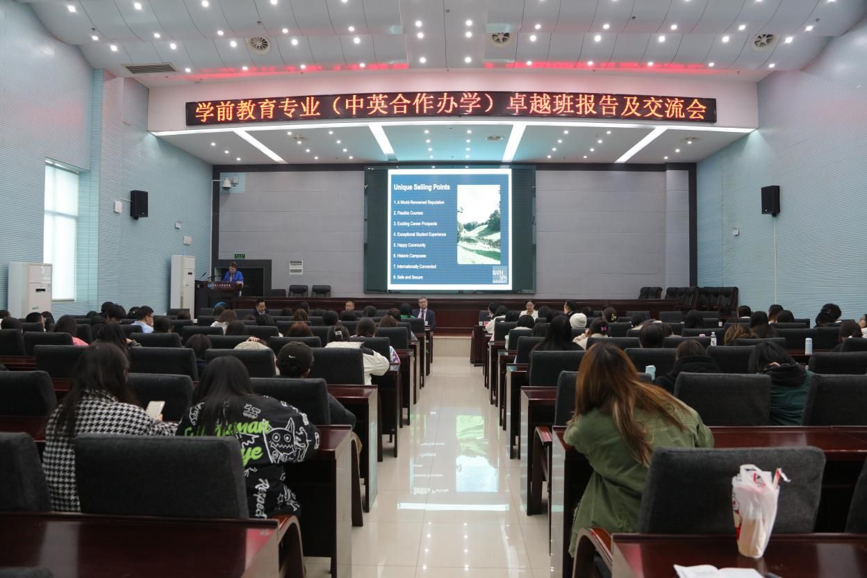 副校长Benjamin随后来到图书馆第二报告厅,参加教育学院学前教育(中英合作办学)专业卓越班报告交流会。巴斯斯巴大学国际招生与合作部主任Jiemin Tomita,党委委员、副校长陈志国出席,国际合作与交流中心主任黄敏,教育学院领导班子,教师代表及2021、2022、2023级卓越班学生参加交流会。Benjamin在报告中主要展示了巴斯斯巴大学的教学理念和人文风采,也分析了出国留学的益处。最后,就同学们关心的学业规划、语言障碍等问题进行了细致的解答。