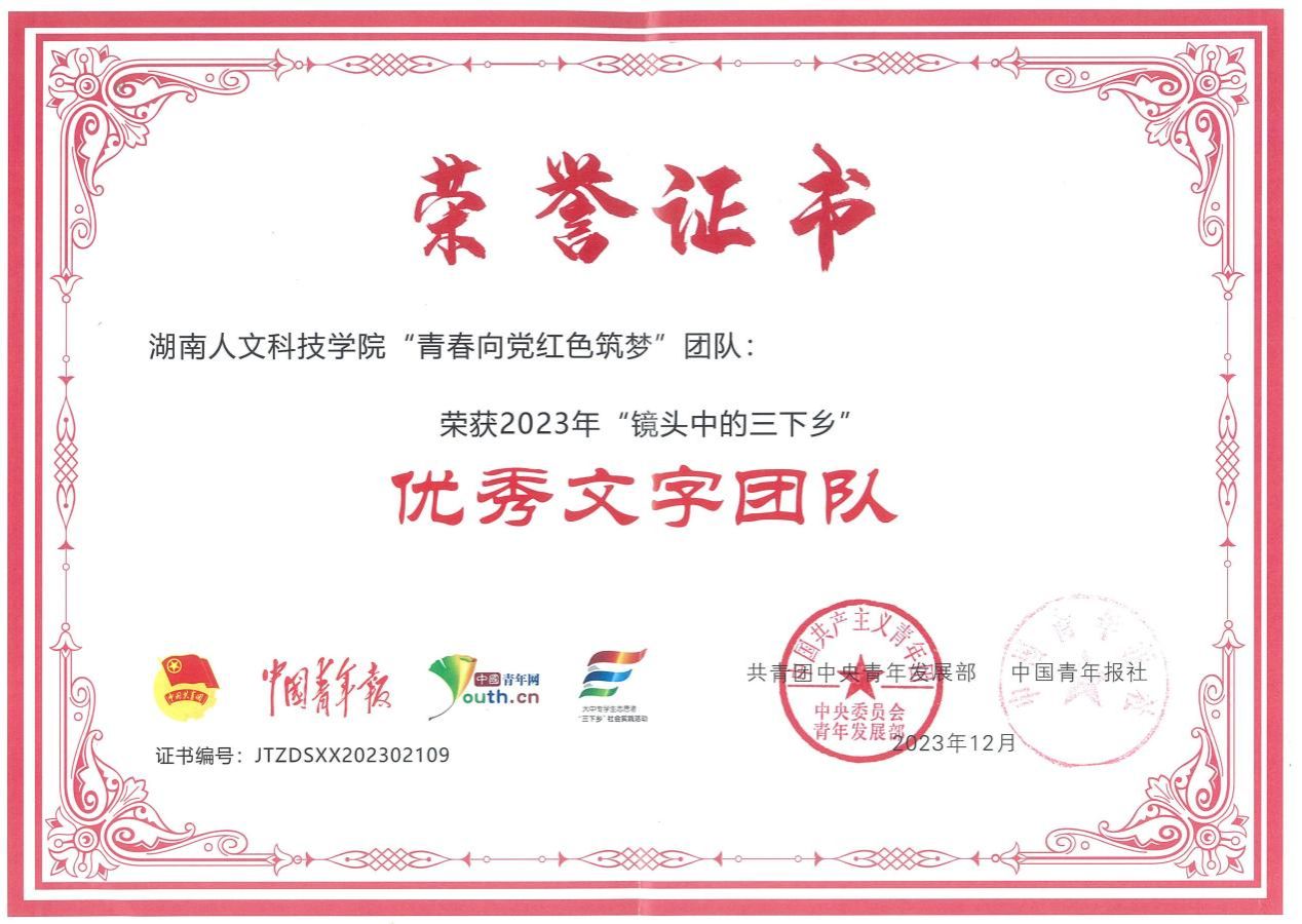近日,由共青团中央青年发展部、中国青年报、中国青年网共同举办的2023年全国大中专学生志愿者暑期文化科技卫生“三下乡”社会实践“镜头中的三下乡”征集活动荣誉证书下发,马克思主义学院“青春向党 红色筑梦”调研团经报名审核、作品发布、网络展示、综合评审等环节,成功获评“全国优秀文字团队”。
