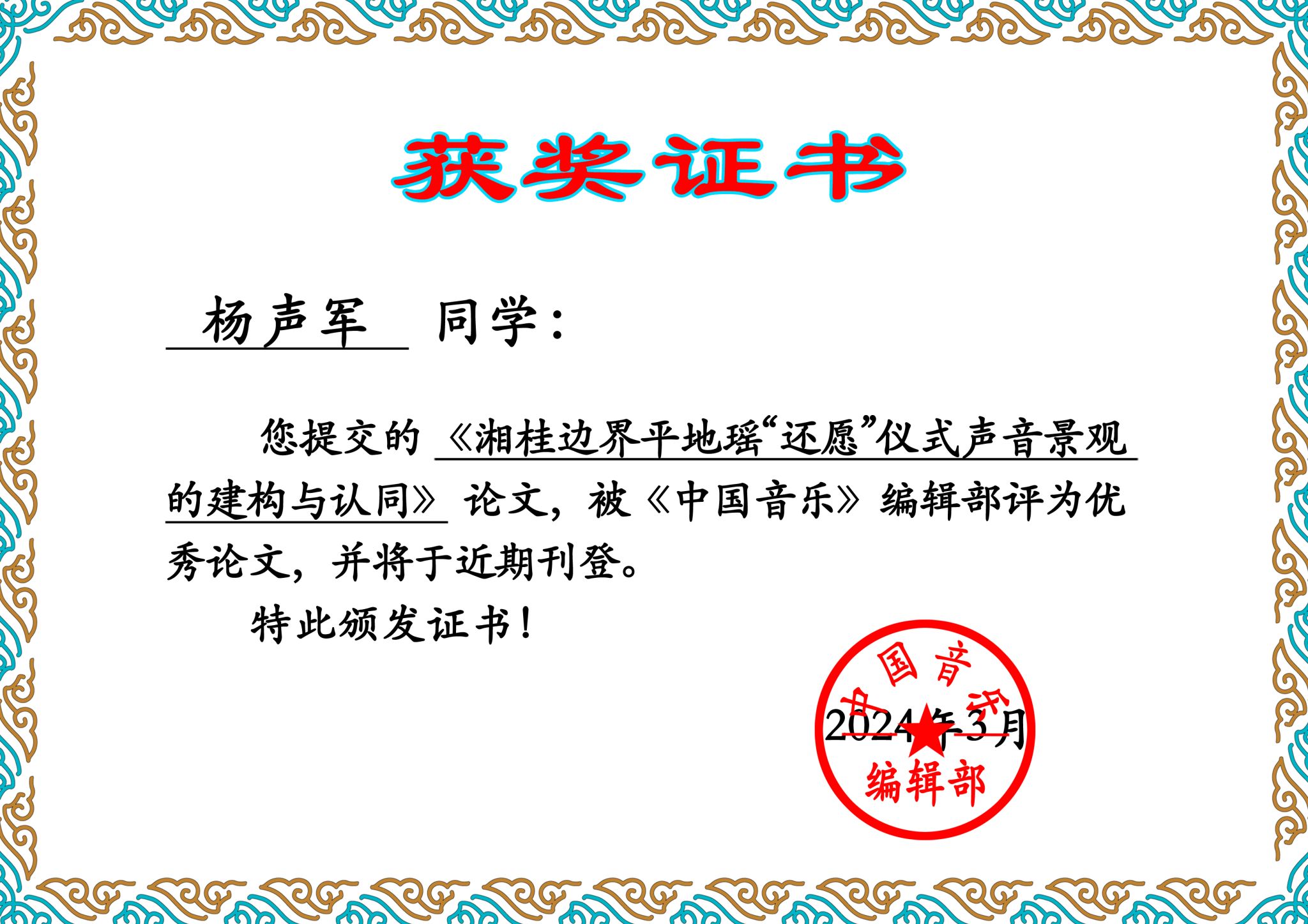 近日,由中国音乐学院、《中国音乐》杂志社主办的第五届音乐学硕博研究生优秀学位论文评选结果公布,beat365音乐舞蹈学院理论教研室博士杨声军老师的博士学位论文《湘桂边界平地瑶“还愿”仪式声音景观的建构与认同》获评优秀博士学位论文(全国21人)。
