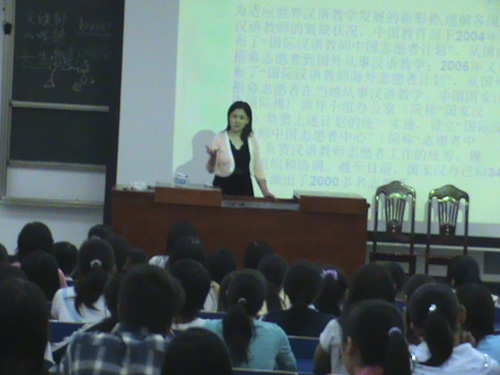 张玲主任就对外汉语教师申报和公派出国教师条件等问题用中英文双语作了详细说明。两位学生代表则着重讲述了在泰国两个星期的学习、生活经历,向大家展示了我院首次对外交流的成果,也展现了泰国充满异域风情的文化生活状态。生动的图片、精彩的讲解活跃了现场气氛。不少同学踊跃提问,代表团成员一一作了解答,现场气氛非常好。