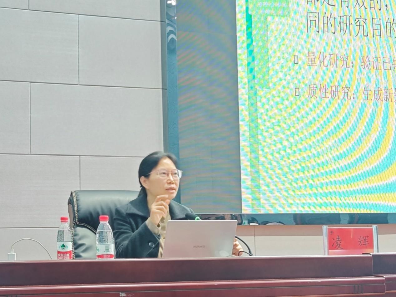 凌辉教授以“量化和质性研究的超越——混合方法研究设计”为题,首先回顾了中外质性研究的发展历程,指出这种研究方法既古老广泛,又行之有效。他详细解读了现阶段质性研究的具体方法,并深入分析了量化研究与质性研究的混合方法,强调研究方法应根据研究目的灵活选择,无高低贵贱之分。接着,她通过课题组的一项混合方法研究实例,展示了如何运用这种方法在高水平期刊上发表成果的可行性。最后,她为本科生提供了实用的建议,涵盖文献阅读、选题、研究计划的制定、论文撰写与发表等,帮助学生顺利展开学术研究。讲座结束后,师生进行了热烈的讨论。