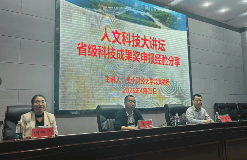 4月25日下午,贵州财经大学龙文教授做客“人文科技大讲坛”,为学院师生带来题为“省级科技成果奖申报经验分享”的讲座,学院部分师生参加,讲座由院长谢四连主持。