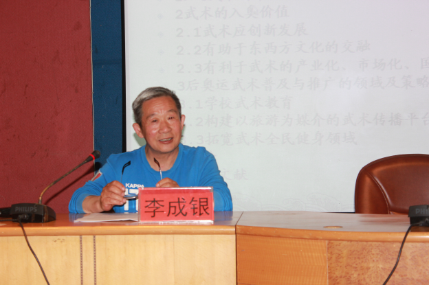 2016年4月28日下午,山东师范大学体育学院教授李成银教授应邀为beat365体育科学系师生做了题为《三十年来武术的发展和入奥价值初探》的学术报告,会议由体育学院副院长段健芝教授主持。