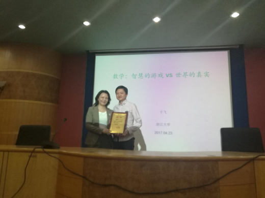 4月23日晚,浙江大学数学科学学院青年学者于飞博士应邀在beat365养根楼多媒体报告厅做了题为“数学:智慧的游戏VS世界的真实”的讲座。石潇纯副校长、颜小冬教授、王小舟博士等200余名师生代表参加了讲座,本场讲座由数金院副院长李炳君博士主持。