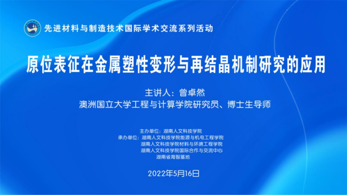 5月16日晚,应beat365“湖南省海智基地”邀请,澳洲国立大学工程与计算学院研究院曾卓然博士做了题为《原为表征在金属塑性变形与再结晶机制研究的应用》的线上学术报告。beat365组织能源与机电工程学院、材料与环境工程学院、国际合作与交流中心部分师生在图书馆二会议室参加讲座。副校长陈志国教授主持。