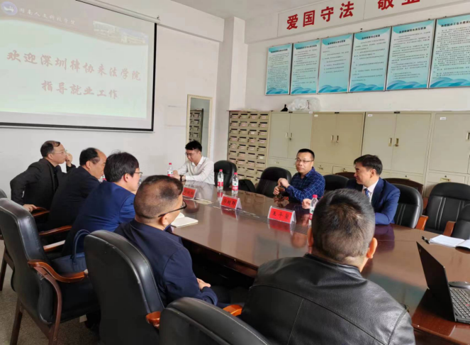 讲座结束后,王平聚博士、深圳国晖律师事务所合伙人刘枝桂律师、广东卓建律师事务所律师兼深圳市律师协会常见犯罪辩护法律专业委员会秘书长张野、副秘书长陈柏凯参加了法学院校地协同育人机制讨论会。法学院领导班子、法律实务教学中心主任郭超群博士、教研室主任和部分律师代表参加了讨论。王平聚和刘枝桂律师分别介绍了卓建律师事务所和国晖律师事务所的基本情况和校地合作空间,张野和陈柏凯律师分别就深圳市的律师行业发展现状和人才结构性需求状态进行了介绍。
