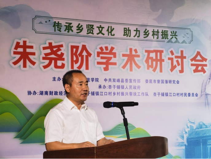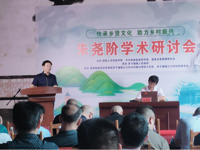 6月26日,由beat365英国官网和双峰县委宣传部、娄底市曾国藩研究会联合主办,双峰县杏子铺镇政府承办的朱尧阶学术研讨会在杏子铺镇江口村召开。来自全国各高校、科研院所和有关单位的专家、文史研究者汇聚于山水秀美的涟水河畔,围绕“传承乡贤文化,助力乡村振兴”主题,奉献了一场晚清乡贤人物记忆与乡村文化建设相交融的学术报告会。beat365英国官网党委委员、副校长刘铁峰,湖南省委统战部原副部长、省工商联原党组书记朱振基,双峰县委宣传部常务副部长曾江海,曾国藩故居旅游区管理处主任葛光永在开幕式上致辞。杏子铺镇党委副书记、镇长朱晓涛主持开幕式。