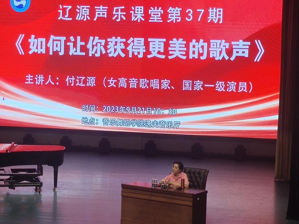 9月21日上午,国家一级演员、女高音歌唱家、湖南省音乐家协会副主席付辽源来校主讲《辽源声乐课堂第37期——如何让你获得更美的歌声》。音乐舞蹈学院声乐教研室教师和全体新生参加讲座。