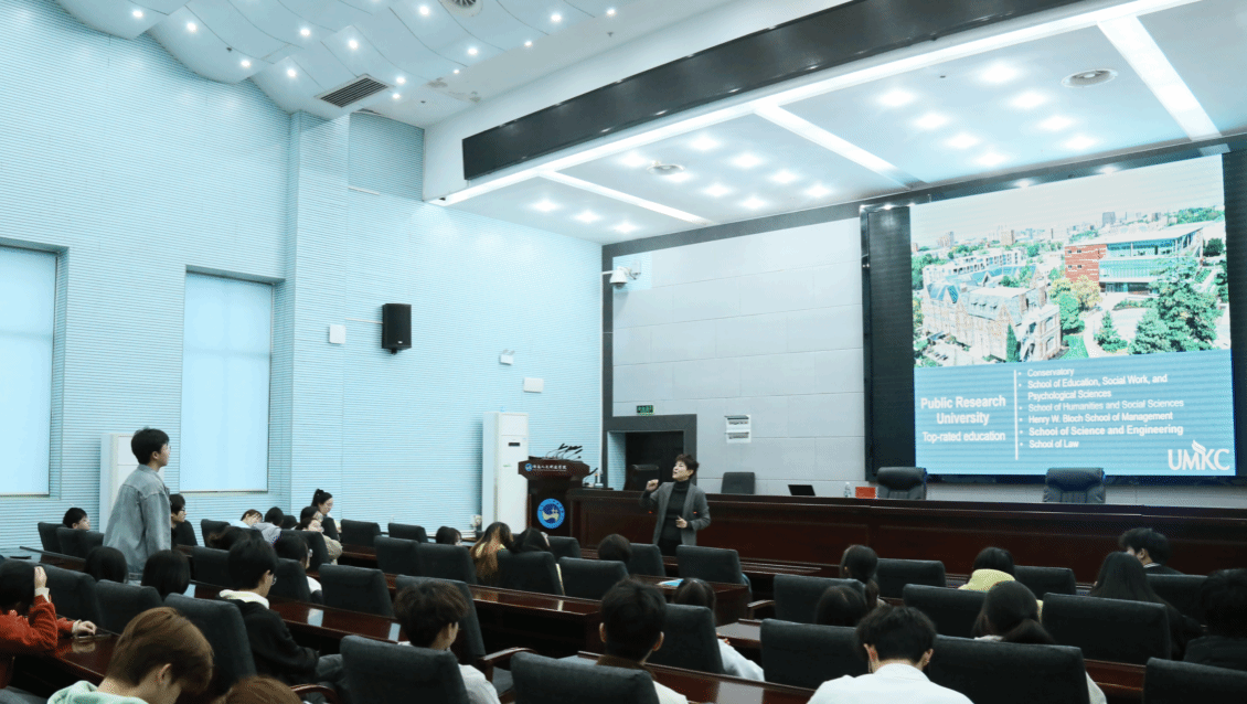 会后,在黄敏陪同下,丁欢向数学与金融学院、能源与机电工程学院、信息学院、材料与环境工程学院等学院的学生代表开展了宣讲。丁欢介绍了密苏里大学堪萨斯分校的教学和科研情况,特别强调了STEM专业的特色和优势。当介绍到与中国的合作项目、奖学金机会以及暑期项目时, 现场的同学们更是兴趣十足。宣讲会还设置了互动提问环节,学生们积极参与,丁主任耐心解答。