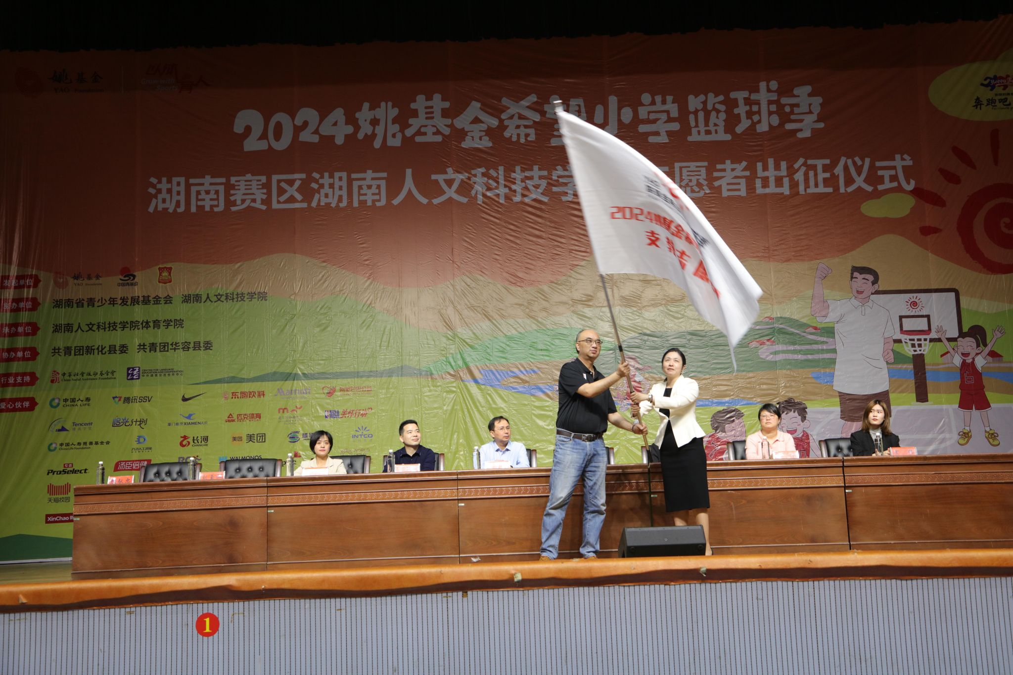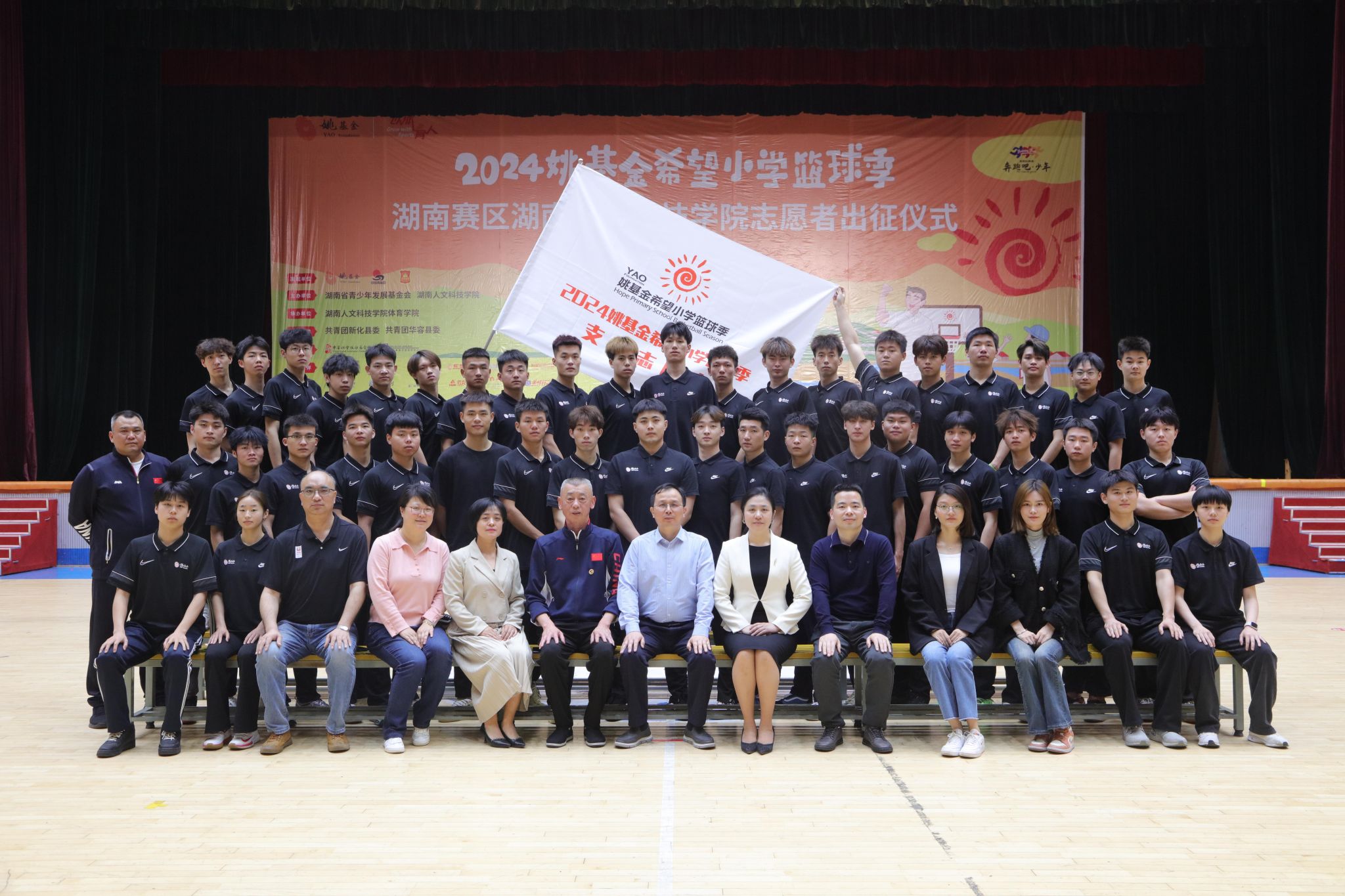 4月23日上午在beat365体育馆举行了2024年“姚基金希望小学篮球季”湖南赛区beat365英国官网志愿者出征仪式。湖南省希望工程办公室副主任、湖南省青少年发展基金会秘书长余秋璇,副校长刘建勋等嘉宾领导出席。体育学院院长刘玉江主持。