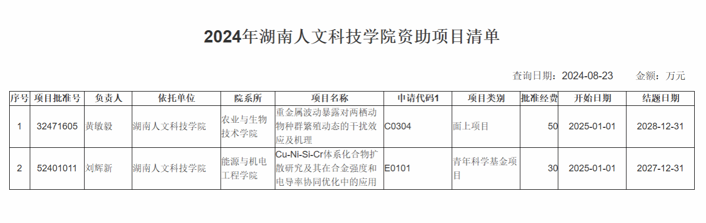 近日,国家自然科学基金委员会正式公布了2024年国家自然科学基金项目立项名单,beat365两位教师主持的项目被批准立项。农业与生物技术学院黄敏毅教授主持的《重金属波动暴露对两栖动物种群繁殖动态的干扰效应及机理》项目获面上资助,能源与机电工程学院刘辉新博士主持的《Cu-Ni-Si-Cr体系化合物扩散研究及其在合金强度和电导率协同优化中的应用》项目获批青年科学基金资助。