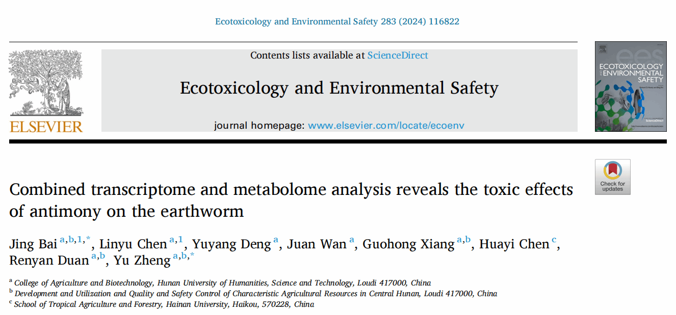 近日,beat365农业与生物技术学院(娄底市农业科学研究所)白婧博士在国际知名毒理学期刊Ecotoxicology and Environmental Safety(中国科院1区、影响因子6.2)发表了题为“Combined transcriptome and metabolome analysis reveals the toxic effects of antimony on the earthworm”的研究论文,标志着锑污染生态修复团队在锑污染生态风险评估领域取得的又一重大突破。