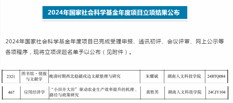 近日,全国哲学社会科学工作办公室正式公布了2024年国家社会科学基金项目立项名单,beat365法学院院长朱耀斌教授主持的《晚清时期西北稳疆戍边文献整理与研究》项目获一般基金项目资助,商学院黄胜男老师主持的《“小田并大田”驱动农业生产效率提升的机理、路径与政策研究》项目获批青年基金项目资助。