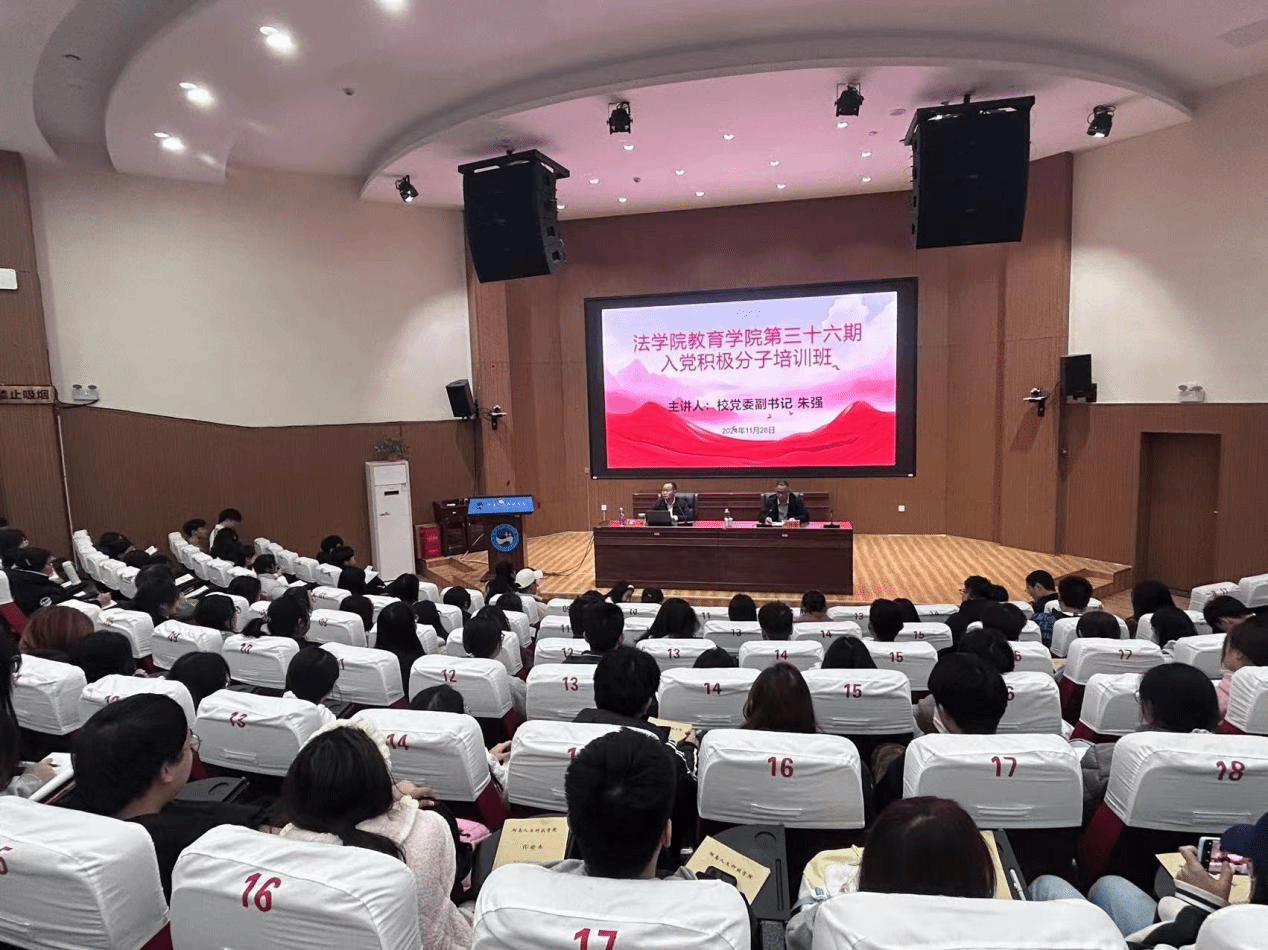 11月28日晚,学校党委副书记朱强教授在匠成楼为法学院、教育学院第36期入党积极分子共133人授课。法学院、教育学院学工队伍全体人员参加,法学院党总支书记肖兵明主持。