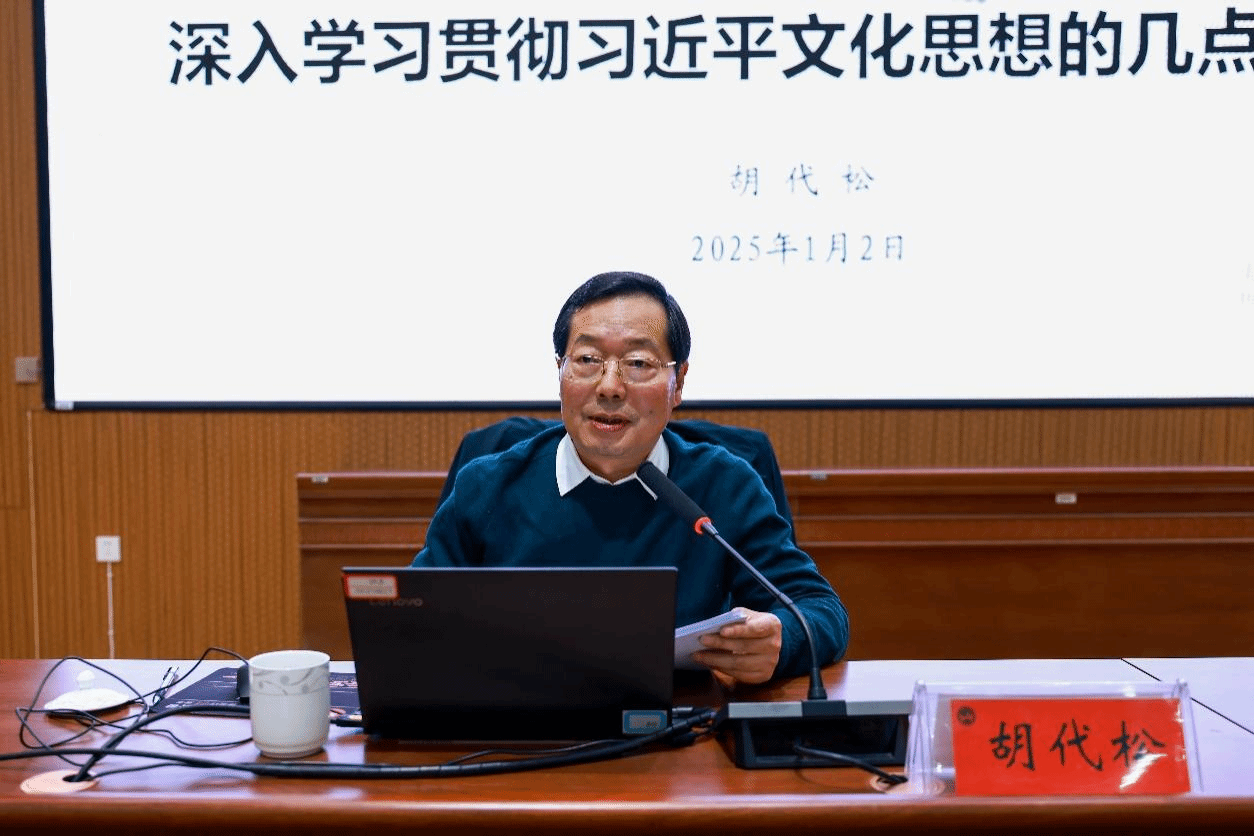 1月2日下午,湖南省社科联党组书记、副主席(主持日常工作)胡代松应邀莅临beat365,在学校匠成楼作《深入学习贯彻习近平文化思想的几点体会》专题讲座。湖南省社科联党组秘书邹康一、全体校领导出席,党委书记刘铁铭主持。
