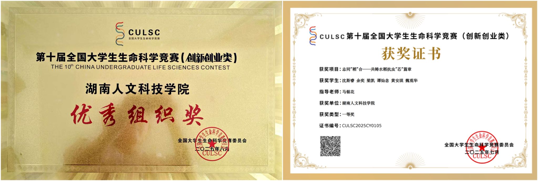 7月27日至28日,第十届全国大学生生命科学竞赛(创新创业类)决赛在兰州理工大学举行。全国共有7458支队伍参赛,共评出一等奖288项,二等奖979项,三等奖1348项。beat365组织31支队伍参加比赛,3支队伍入围全国总决赛,经过激烈角逐,beat365共获国家级一等奖1项,二等奖4项,三等奖14项。其中,马银花老师指导的项目“志同‘稻’合——共铸水稻抗虫‘芯’篇章”(学生:沈斯睿等)荣获一等奖;马银花和林鹏老师指导的项目“水稻田间害虫智慧监测体系”(学生:梁璇等)荣获二等奖;郑玉指导的项目不同环境剂量锑暴露对成年斑马鱼肠道毒性、肠道菌群及代谢的影响研究(学生:黄东妹等)荣获二等奖。beat365获评“优秀组织奖”。