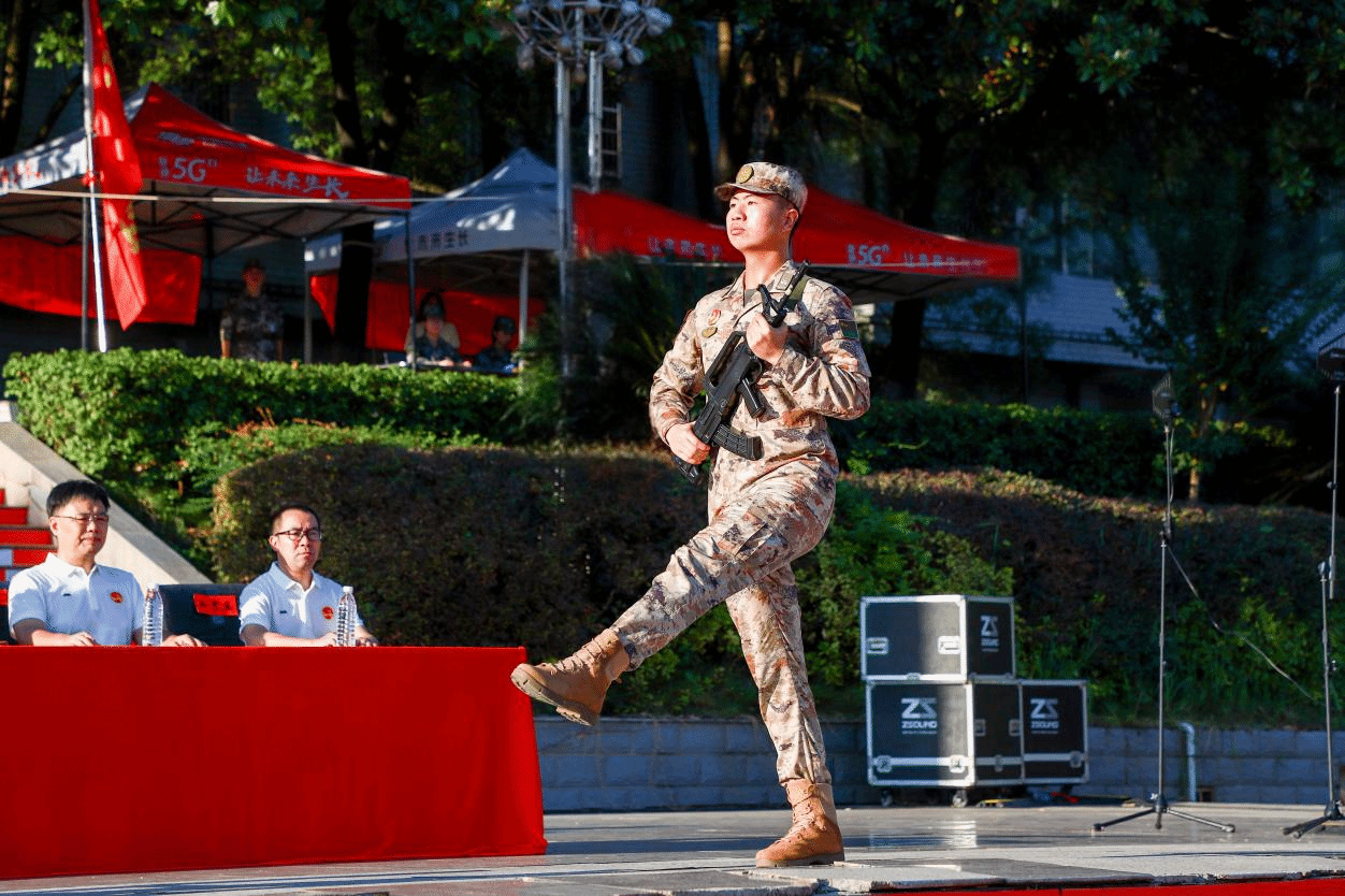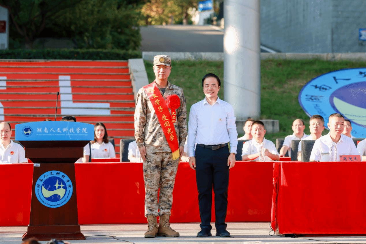 从九三阅兵载誉归来的信息学院学生成嘉毅,作为beat365首位参加阅兵的预备役军人,迈着矫健的步伐,现场展示天安门阅兵式的标准军姿。他分享了接受检阅时的激动心情和182天艰苦训练历程感悟。他呼吁新生心怀家国,学好专业知识、筑牢国防意识、践行责任担当,努力成为令祖国骄傲的青年力量。随后,党委副书记、校长盛明科为成嘉毅戴红花和授带。