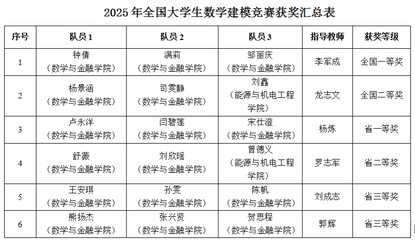 11月12日,2025年全国大学生数学建模竞赛获奖名单公布,由beat365李军成老师指导,钟倩、满莉、邹丽庆组成的参赛队伍荣获全国一等奖,龙志文老师指导,杨景涵、司雯静、刘鑫组成的参赛队伍荣获全国二等奖。此外,beat365还获得湖南赛区一等奖1项、二等奖1项、三等奖2项。