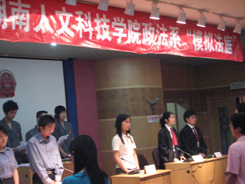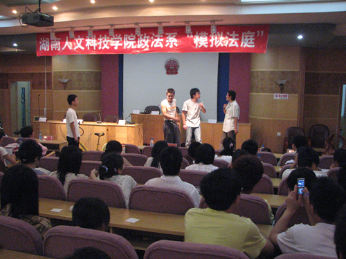 2007年5月20日晚7:30,政法系模拟法庭于多媒体报告厅正式演出。院团委副书记周海强、谢柳,政法系主任游训龙、副主任朱耀斌、法学教研室主任罗光宇、团总支书记刘佳,政法系200多位师生观看了这一演出。
