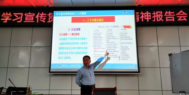 朱强强调,学习宣传贯彻党的二十大精神,关键要落实到“贯彻”两个字上,一定要学以致用,解决好“为何学”、“学什么”、“怎么学”、“怎么干”的问题。作为高校教师,一定要深刻把握教育根本问题、全面理解立德树人内涵、自觉强化使命责任担当、系统提升教育教学能力,学生要树立终身学习观念、要有能吃苦耐劳的精神,抱有远大理想,不负党和国家的殷切嘱托。(文/图:相好平)