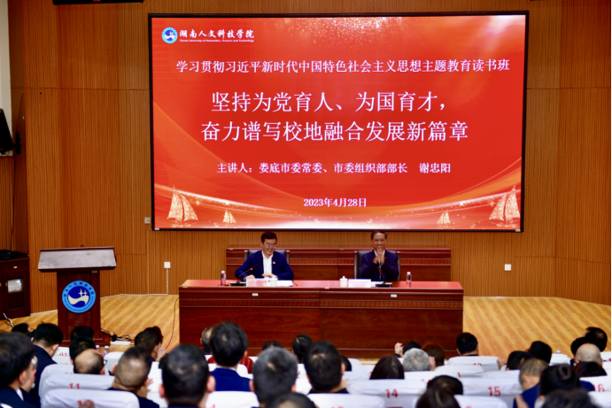 4月28日下午,娄底市委常委、组织部部长谢忠阳同志来校为学习贯彻习近平新时代中国特色社会主义思想主题教育读书班作专题辅导报告。全体校领导出席,全校科级以上实职干部聆听报告。报告会由党委书记刘铁铭主持。