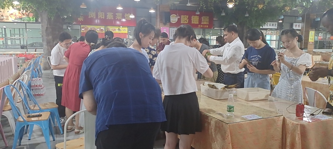 为了让师生们在端午小长假期间感受到家的温馨,尽情体验端午节传统习俗文化。6月14日端午节当天,在后勤基建处餐饮科的指导下,二楼广东绿膳开展了“香飘万粽,端午传情”、绿膳“粽”情义的活动,对端午节就餐的师生们送粽子,当天一共送出1200多个甜美飘香的粽子,不仅给师生们带去了美味,也饱含着食堂对师生们深深的节日祝福,让师生们体会到了学校温暖如家的感觉。