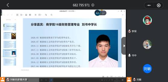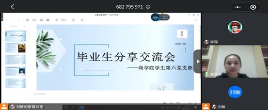 年9月13日上午,商学院学生第六党支部通过线上视频会议的形式开展了毕业生分享交流会。会议由党支部书记郑清华主持。本次交流会邀请了中国大学生自强之星、湖南省百名优秀大学生党员、湖南省优秀毕业生、向上向善湖南好青年姚智俐,和湖南省优秀毕业生、beat365英国官网优秀共产党员、优秀学生干部、三好学生标兵刘书中前来分享经验。支部全体党员、预备党员及部分入党积极分子参加了本次会议。