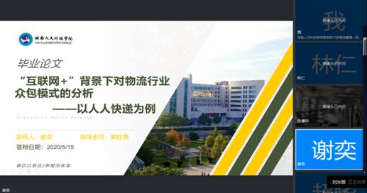 5月15日上午,商学院物流管理专业迎来首届毕业论文答辩。由于受疫情影响,本次答辩采取“钉钉会议”平台开展远程线上汇报,论文答辩分为3个小组同时进行。院长朱强教授、副院长刘加林教授、教研室主任龚瑞风博士以及其他4位指导老师组成答辩专家组,2016级物流管理1班同学参与本次答辩汇报会。