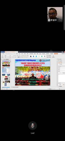 619日晚7:00开始,湖南工商大学罗湖平教授通过腾讯会议,给我院财务管理专业2019级学生作了题为“挑战杯精神引领的商科大学生创新教育实践途径探讨。”的创新思维与能力训练的专题讲座,讲座持续近三个小时。