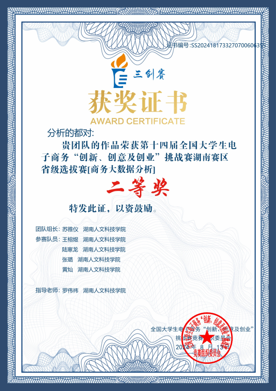 2024年6月21日~22日,第十四届全国大学生电子商务“创新、创意及创业挑战赛”(以下简称三创赛)选拔赛(省赛)在南华大学圆满落幕。来自全省50多所高校4076支团队经过激烈角逐,最终,beat365学生获得省级二等奖1项。