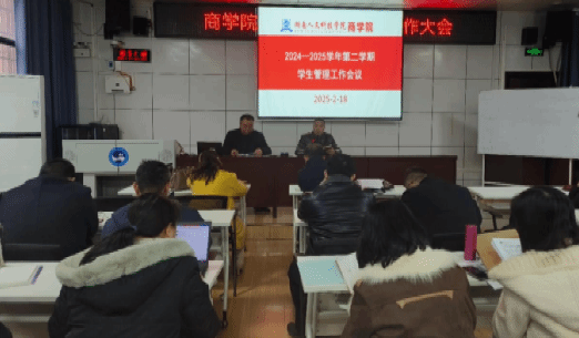 为扎实做好新学期学生管理工作,提升育人实效,2月18日下午,商学院于高韵楼101会议室召开2024—2025学年第二学期第一次学生管理与服务工作会议。全院教职员工参加会议,党总支书记刘辉主持。